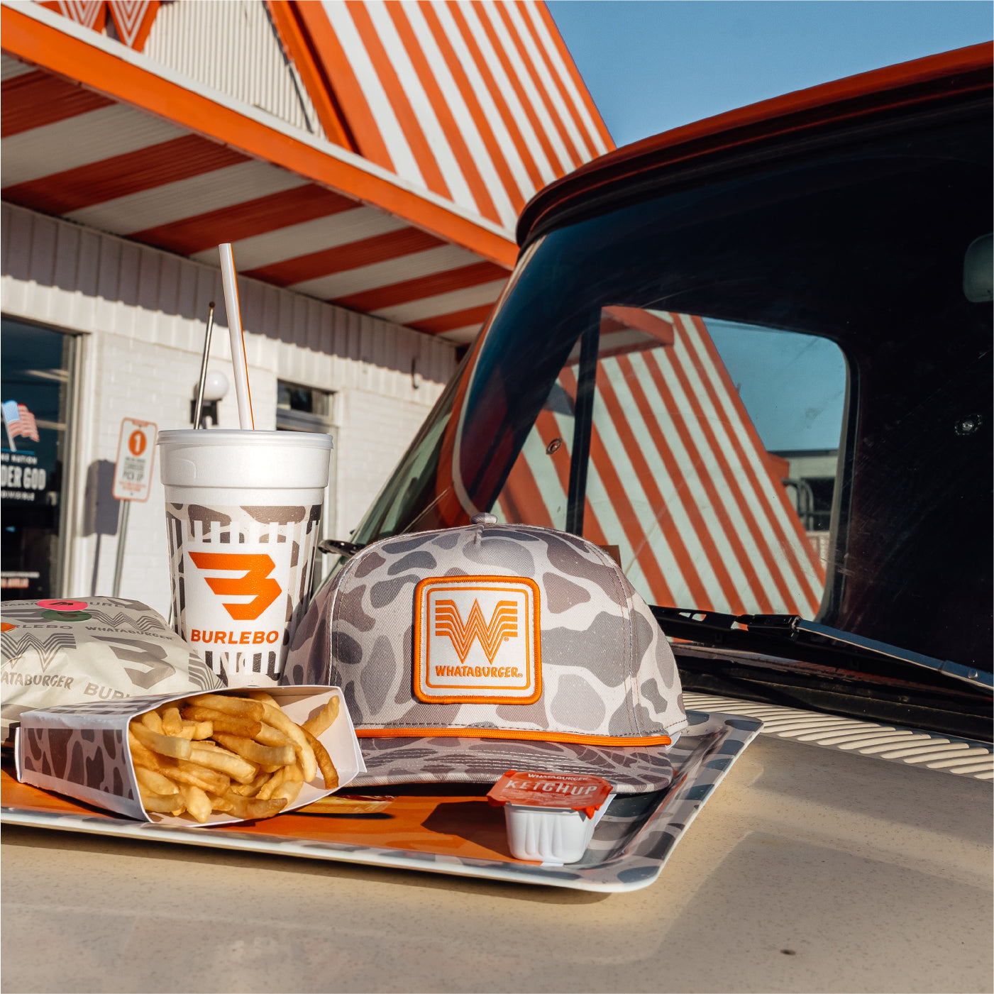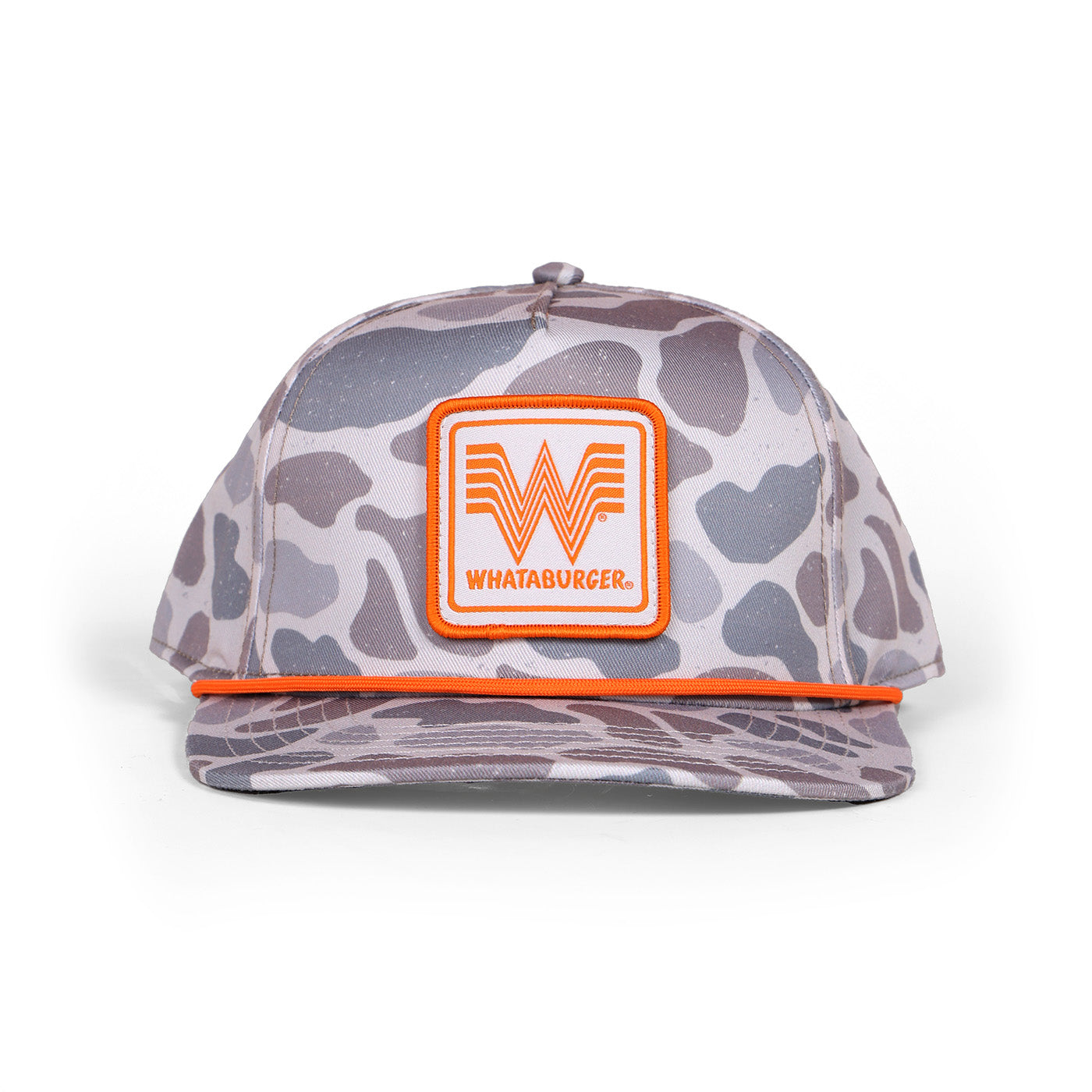 Our Limited Edition BURLEBO x WHATABURGER COLLECTION. This is a Low Profile 5 Panel Snap Back Cap with Rope. In Classic Deer Camo featuring a Whataburger Logo Patch, made of a Ripstop Material. Includes Whataburger logo patch design on the front.