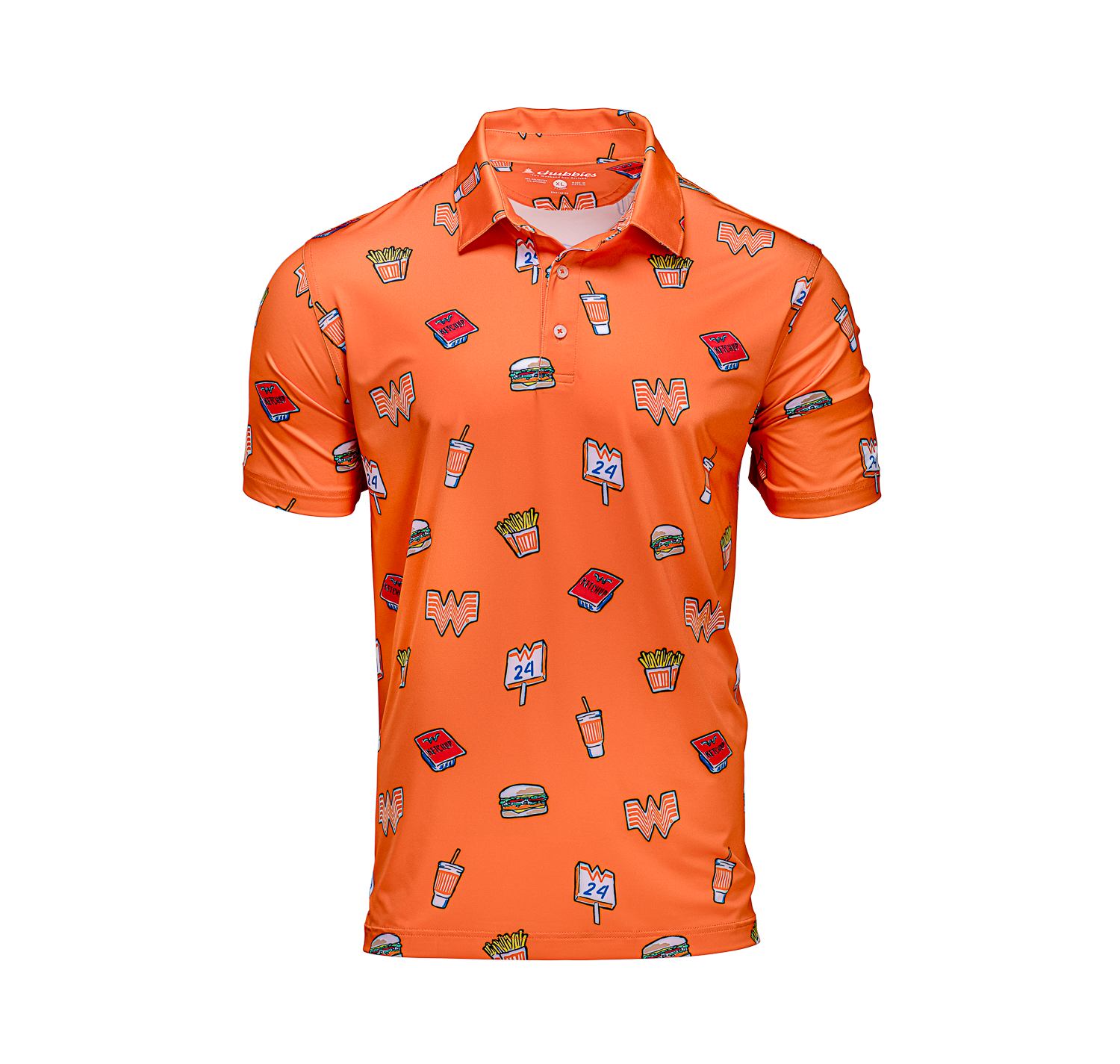 Rock the summer vibes with the Chubbies® Orange Polo! A polo so extremely stretchy and breathable, you’ll wonder how you ever performed without it. Featuring a vibrant orange color and playful Whataburger graphics, this polo is perfect for a fun day out.
