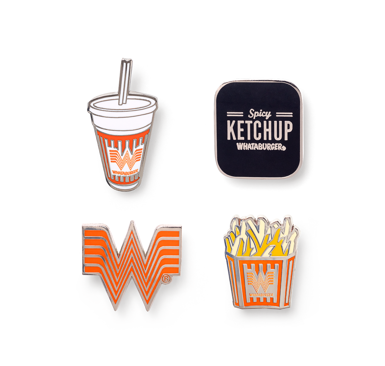 Show off your love for Whataburger with this set of 4 enamel pins! Featuring iconic Whataburger items like the Striped Cup, Spicy Ketchup, and Whataburger Fries, as well as the Flying W logo, this set is perfect for any true fan. Pin them on your backpack, jacket, or hat for some extra flair!
