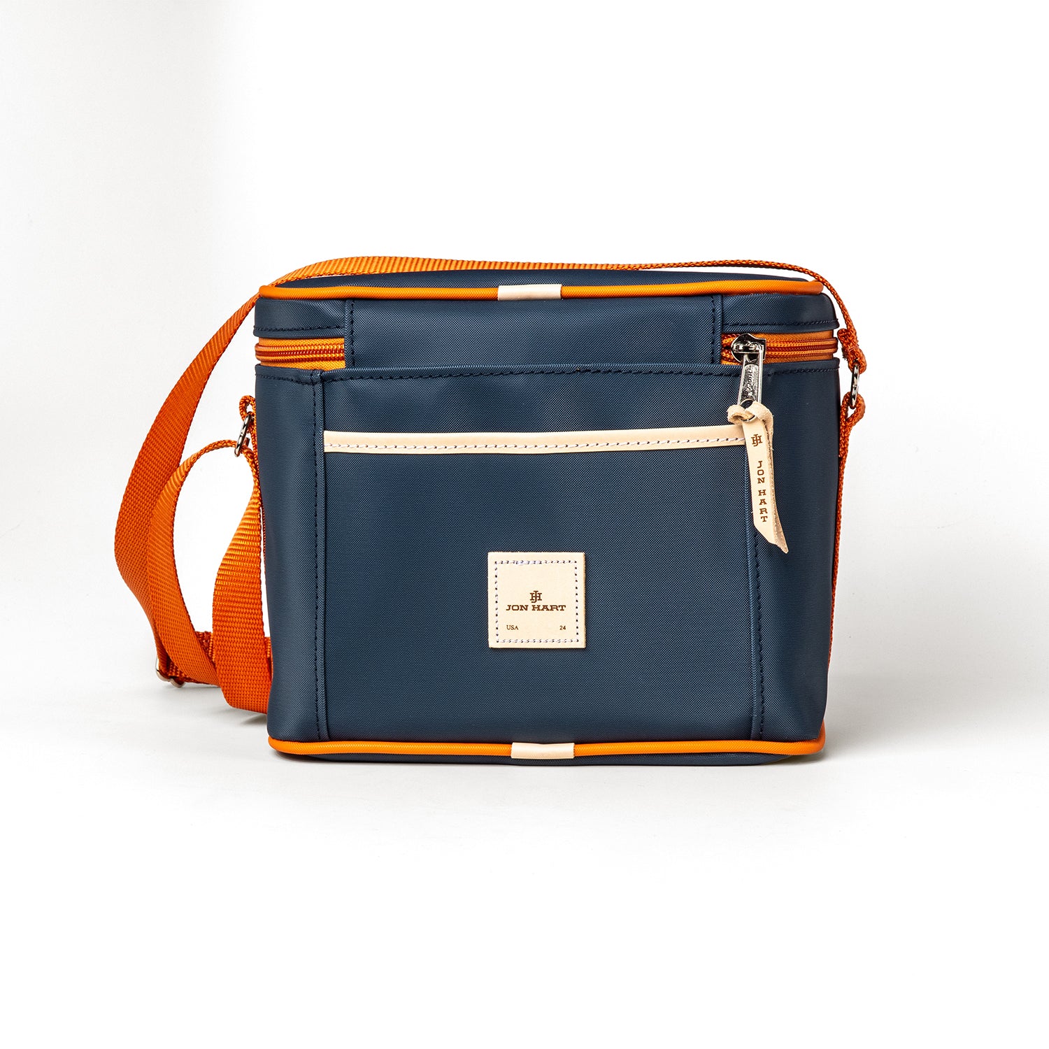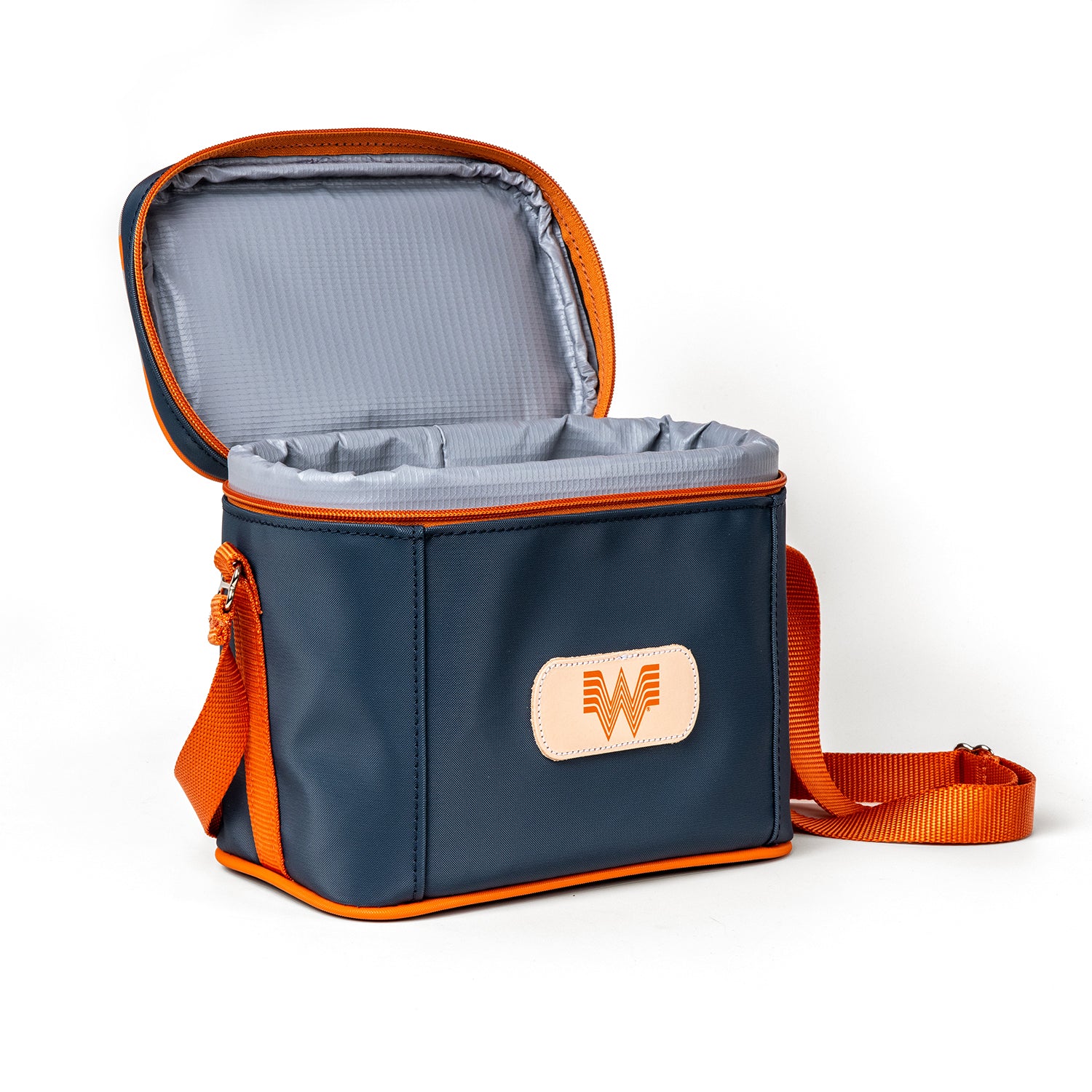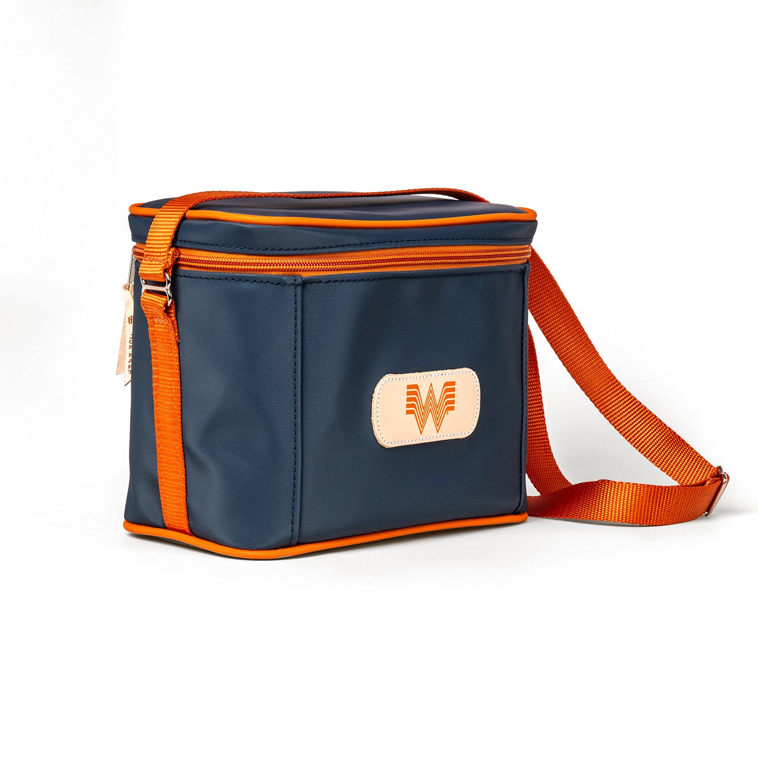 The options are truly endless for the limited-edition Whataburger Jon Hart Frio made of navy coated canvas and orange natural leather trim and accents. Contains a removable, insulated insert to keep the contents cool and make clean up a breeze. Comfortably fits up to a 6-pack plus a cold block, as this item is NOT made to hold ice. Zippered closure and adjustable shoulder strap for easy carrying. Includes an exterior open pocket on the back for storage.