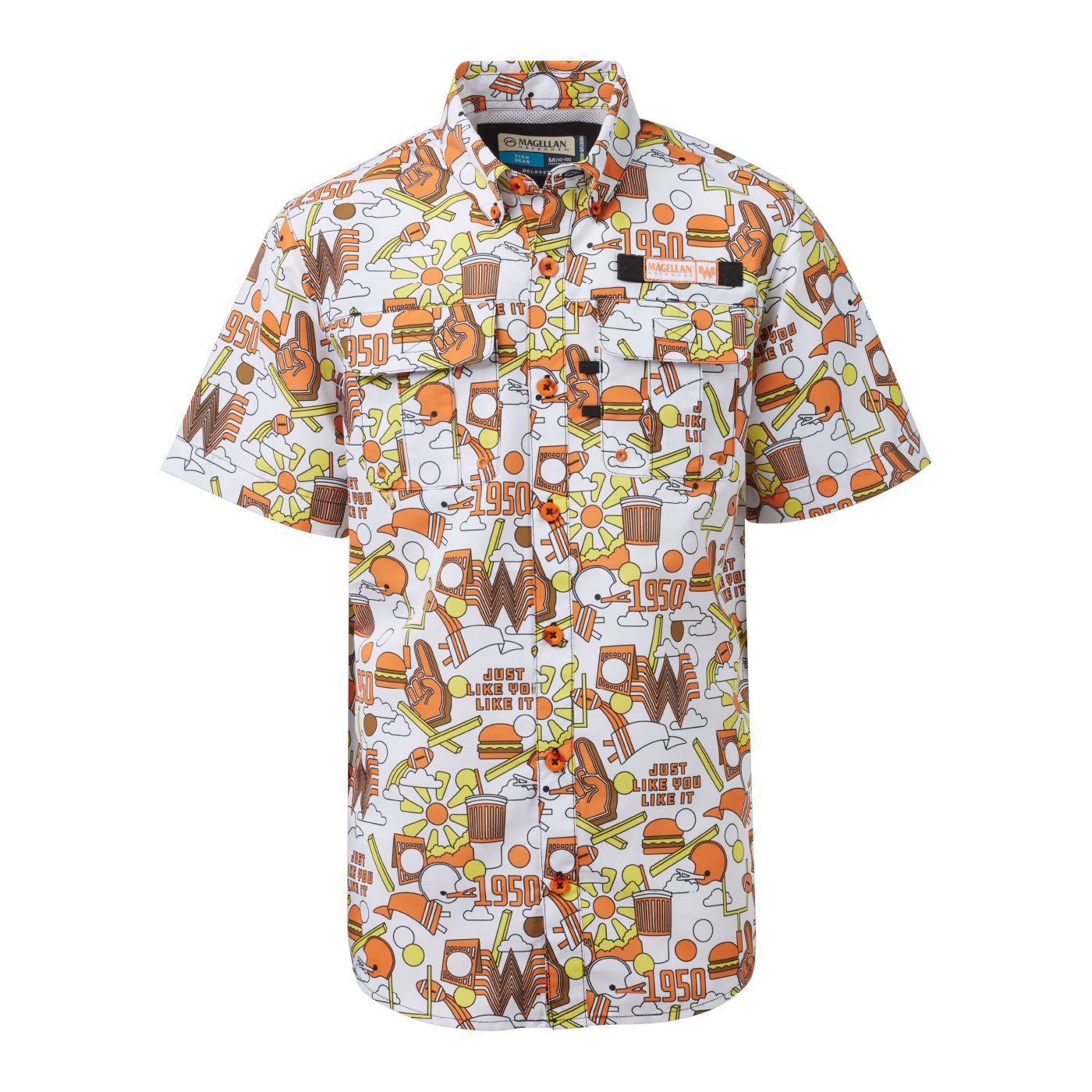 Liven up your clothing collection with the Magellan Outdoors x Whataburger Laguna Madre Happy Crazy Fun Short Sleeve Fishing Shirt. The polyester material is built for frequent use, and the relaxed fit gives you an easygoing wearing experience. The short sleeves keep you cool, and the button-down closure gives you a polished look.