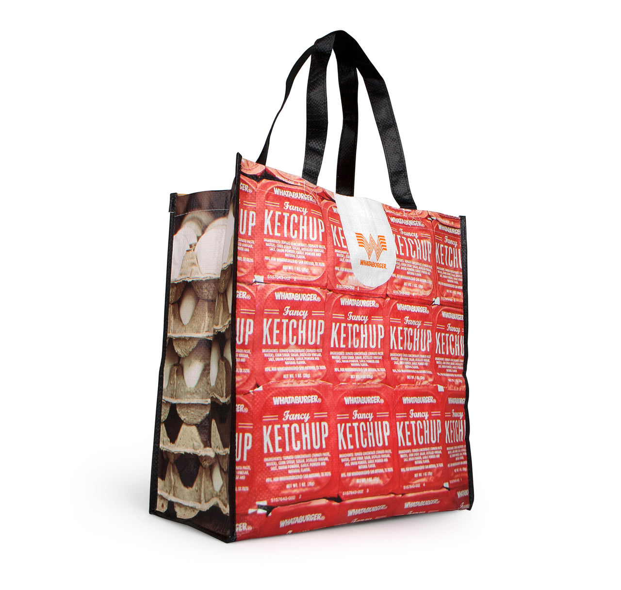 Set of 3 reusable grocery bags, uniquely printed on all four sides with recognized Whataburger products.