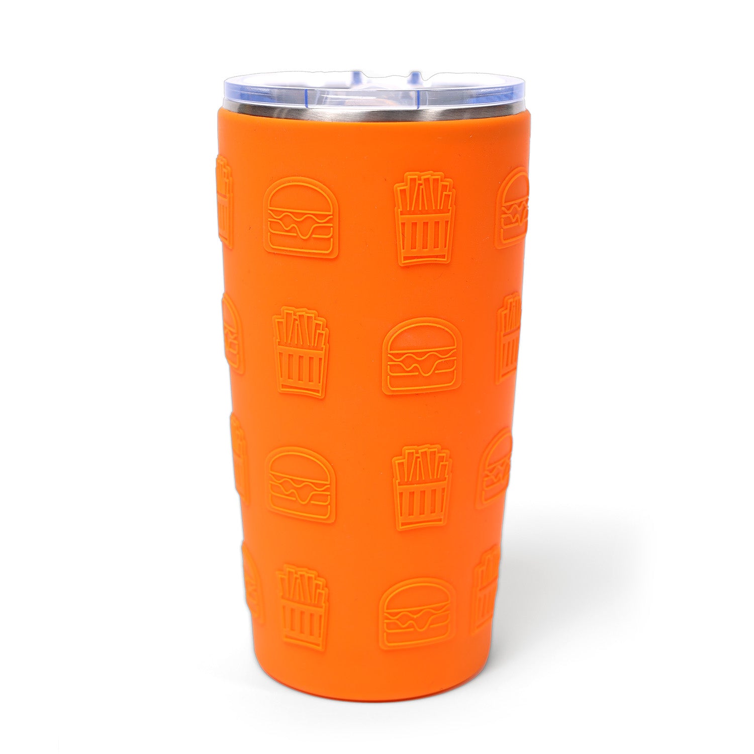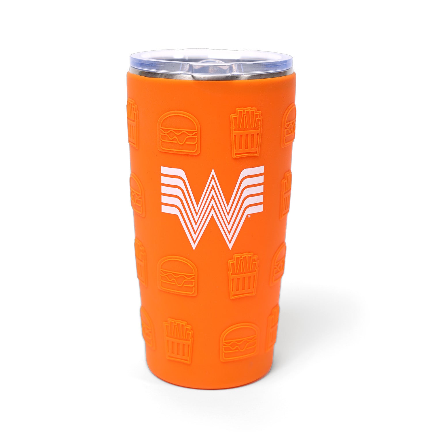 Sip your favorite drink in style with our Silicone 20oz Tumbler! This stainless steel tumbler features a fun orange silicone sleeve with an embossed burger and fry design, as well as a printed Whataburger logo. The clear slide lid keeps your drink secure while on the go. Quirky and functional, this tumbler is perfect for any Whataburger fan!