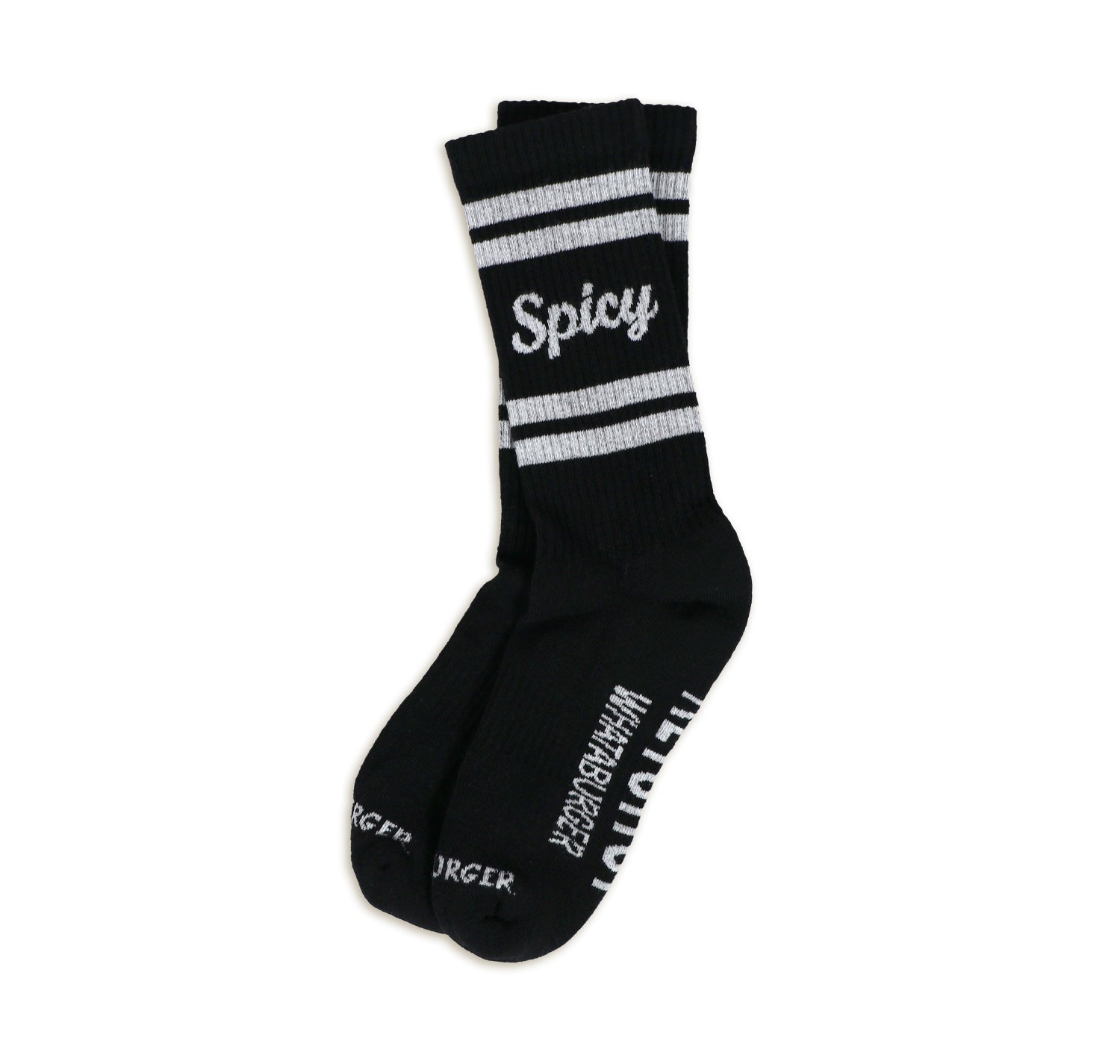 Spice up your sock game with our Spicy Ketchup Athletic Socks!Based on the Spicy Ketchup from Whataburger that you love, these black socks with white stripes and a bold Whataburger logo on the toes will add a kick to your workouts.