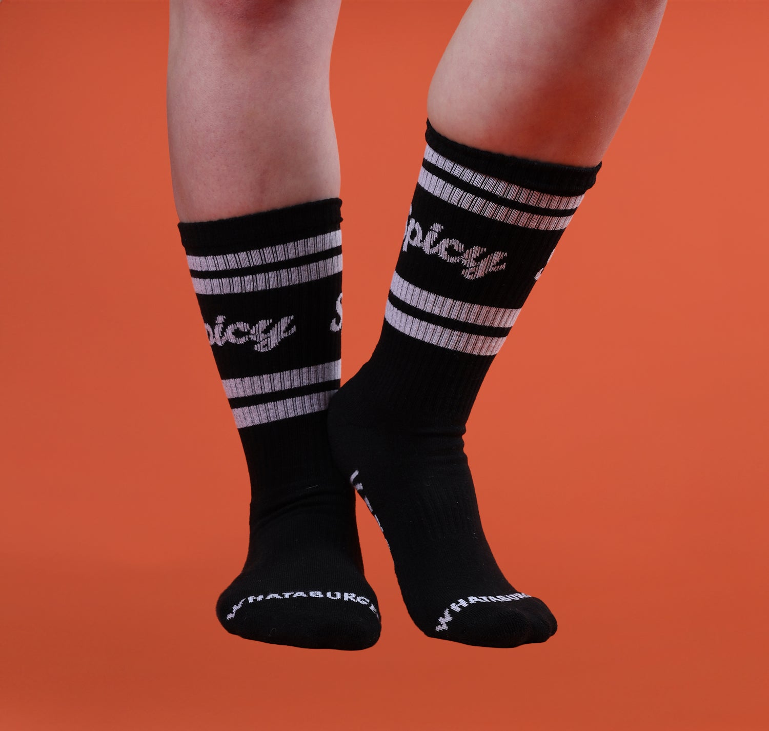 Spice up your sock game with our Spicy Ketchup Athletic Socks!Based on the Spicy Ketchup from Whataburger that you love, these black socks with white stripes and a bold Whataburger logo on the toes will add a kick to your workouts.