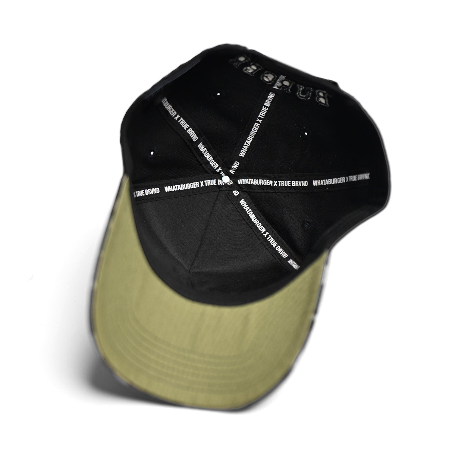 Get ready to turn heads with the True Brvnd® Black Camo Whataburger Hat! Made with 100% cotton, this structured snapback hat features an upside down tone-on-tone black WHATA design on a sleek black hat, paired with a stylish camo bill. Show off your love for Whataburger in a unique and trendy way.