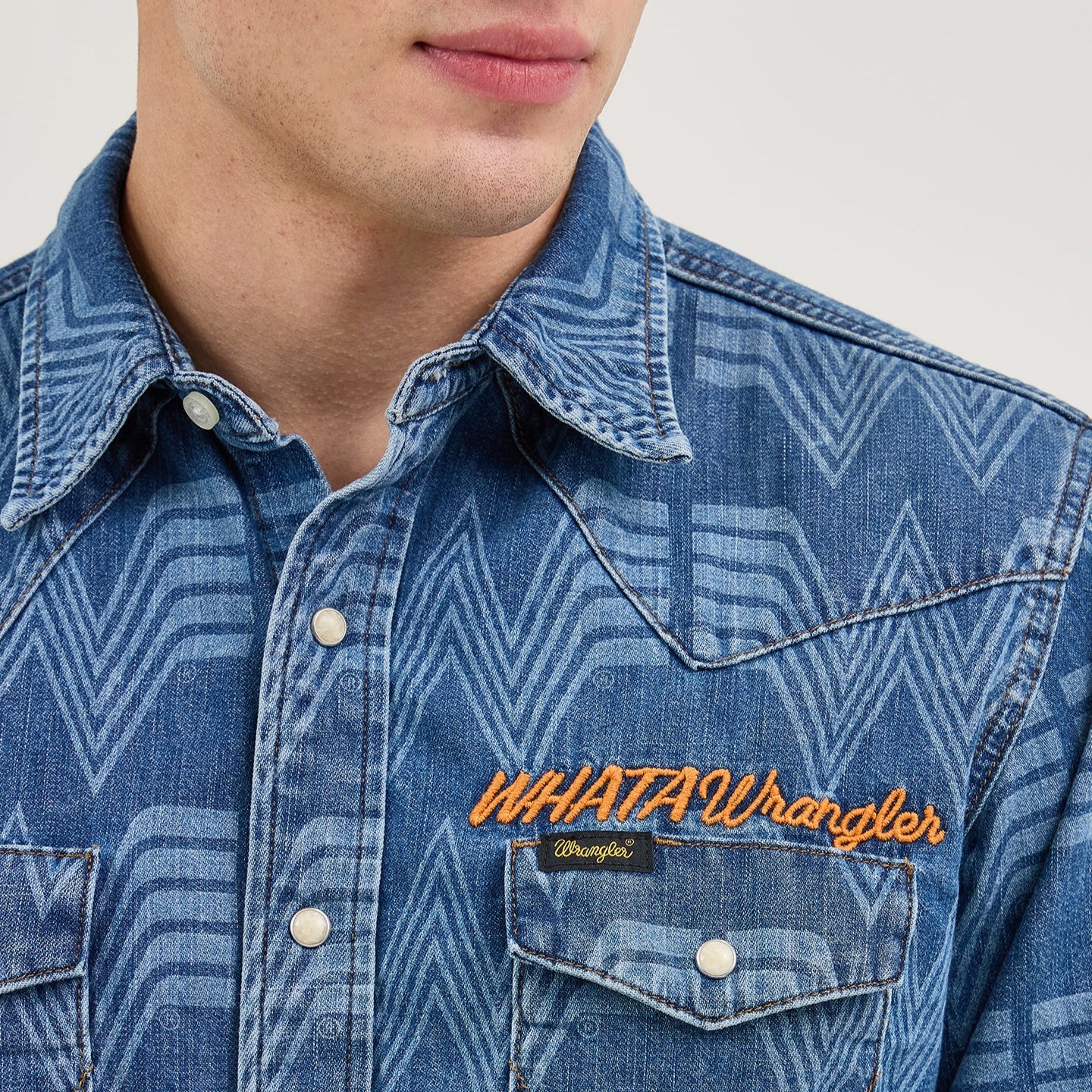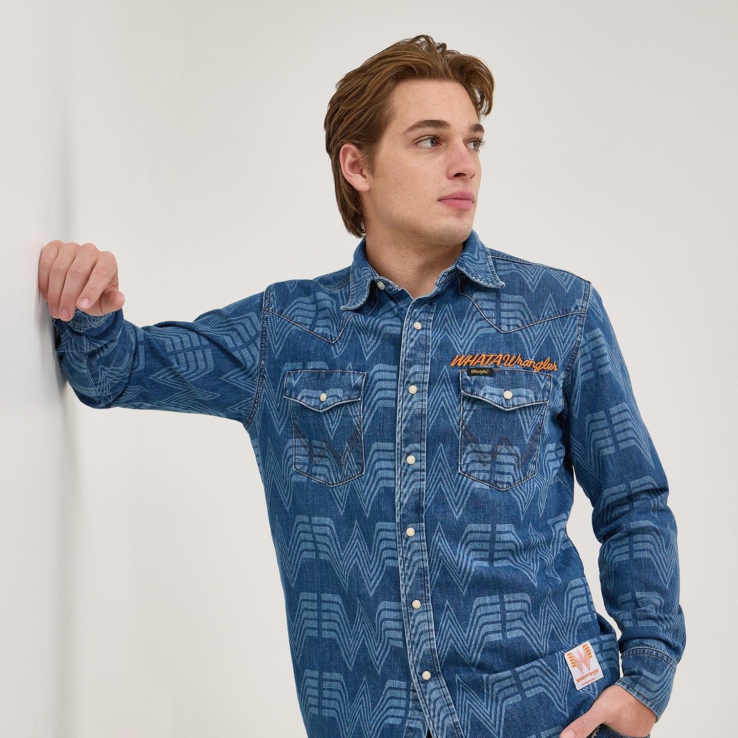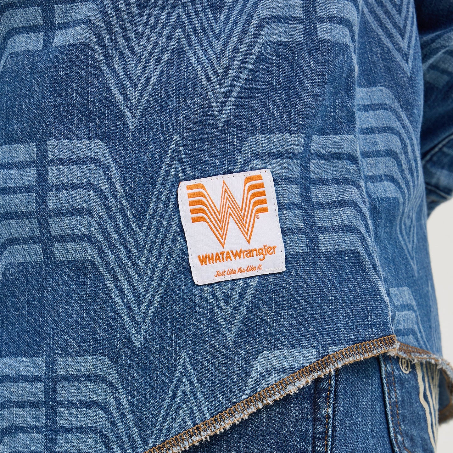 You’ve got great taste—in denim and in burgers. The Wrangler® x Whataburger® Western Print Shirt gives you the best of both worlds in one iconic style that’s ready for rodeo nights and late drive-thru runs. It’s crafted from 100% cotton in a medium blue wash with a lasered “flying W” print from front to back that’ll give you a two-toned look. This classic collared shirt comes with the signature pearl snaps and chest flap pockets with ‘W’ stitching as well as an embroidered collaboration logo below the yoke and a woven label at the hem.